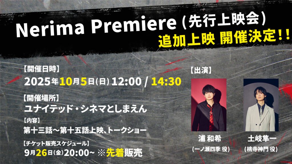 10月5日開催予定のNerima Premiere(練馬編先行上映会)につきまして、応募多数につき追加上映の実施が決定いたしました!